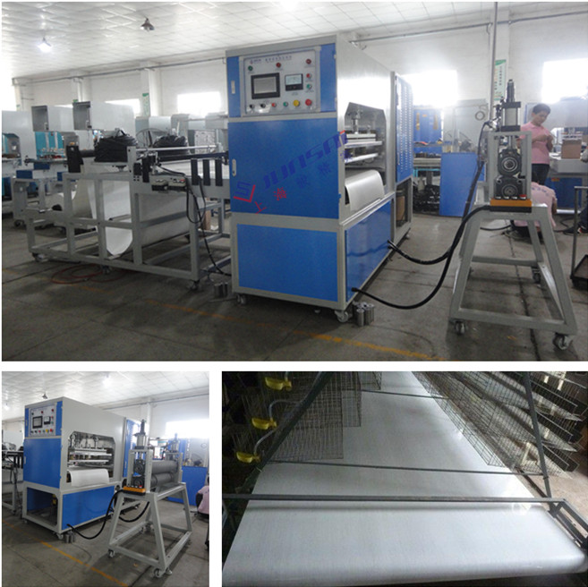 养殖传送带高周波热合机,用电子管自激震荡器产生一个高频电场施加在电极上,被加工塑料在上、下电极间的高频电场作用下,其内部分子产生熔化现象而自身产生热量,在压力的作用下达到热熔的目。